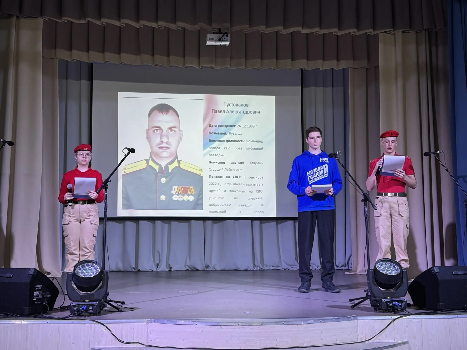 Второй блок посвятили историям защитников Родины. Это были не просто рассказы, а исследовательские работы. Школьники изучили биографии и подвиги наших земляков — участников СВО, собрали факты, документы, воспоминания.