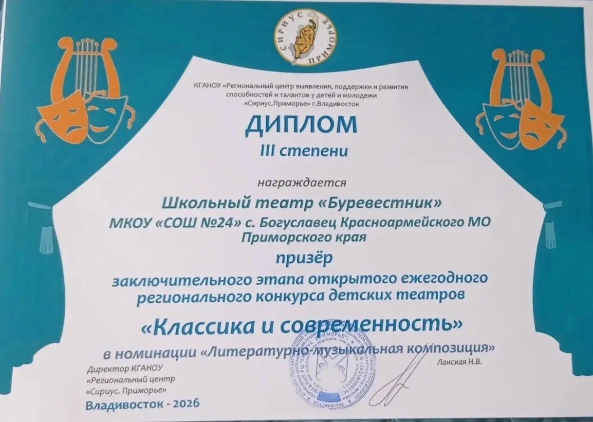 Во Владивостоке прошёл заключительный этап открытого ежегодного регионального конкурса детских театров «Классика и современность». Наш округ представлял школьный театр «Буревестник» из села Богуславец, который ранее одержал победу на муниципальном этапе.